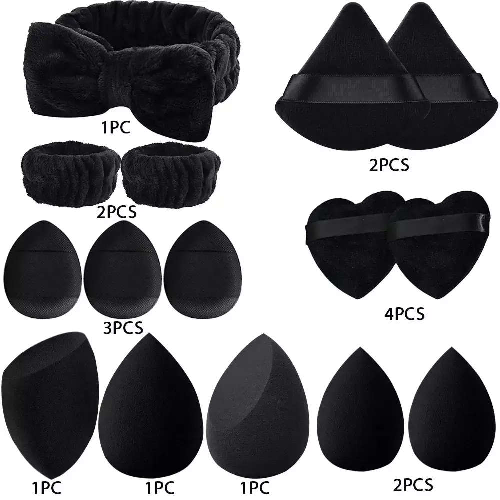 17 esponjinhas flexíveis em cores variadas (preto, rosa, roxo) para diferentes funções na maquiagem: base, corretivo, pó, contorno e iluminação